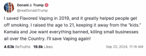 En 2019, alors que la panique autour du vapotage chez les adolescents atteignait son paroxysme, l'administration Trump avait initialement proposé une interdiction totale des produits de vapotage aromatisés. Mais face à la levée de boucliers de millions de vapoteurs adultes, de petits commerçants et de défenseurs de la réduction des risques, le président Trump a opéré un revirement, promettant de préserver les options de vapotage aromatisées pour les adultes tout en s'attaquant à l'accès des jeunes par la répression, et non par l'interdiction.