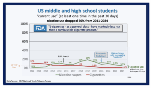 Malgré la multiplication des études scientifiques preuve Bien que la FDA soutienne le vapotage comme une alternative bien plus sûre aux cigarettes combustibles, elle continue de refuser ou de retarder l'autorisation de la quasi-totalité des produits aromatisés. Parallèlement, elle fournit peu d'explications aux entreprises sur la manière de mener à bien la procédure PMTA (Demande d'autorisation de mise sur le marché d'un produit du tabac). Pire encore, l'agence confond souvent l'expérimentation chez les jeunes avec une consommation à long terme, ignorant les données qui montrent une baisse spectaculaire du vapotage chez les adolescents depuis 2019.